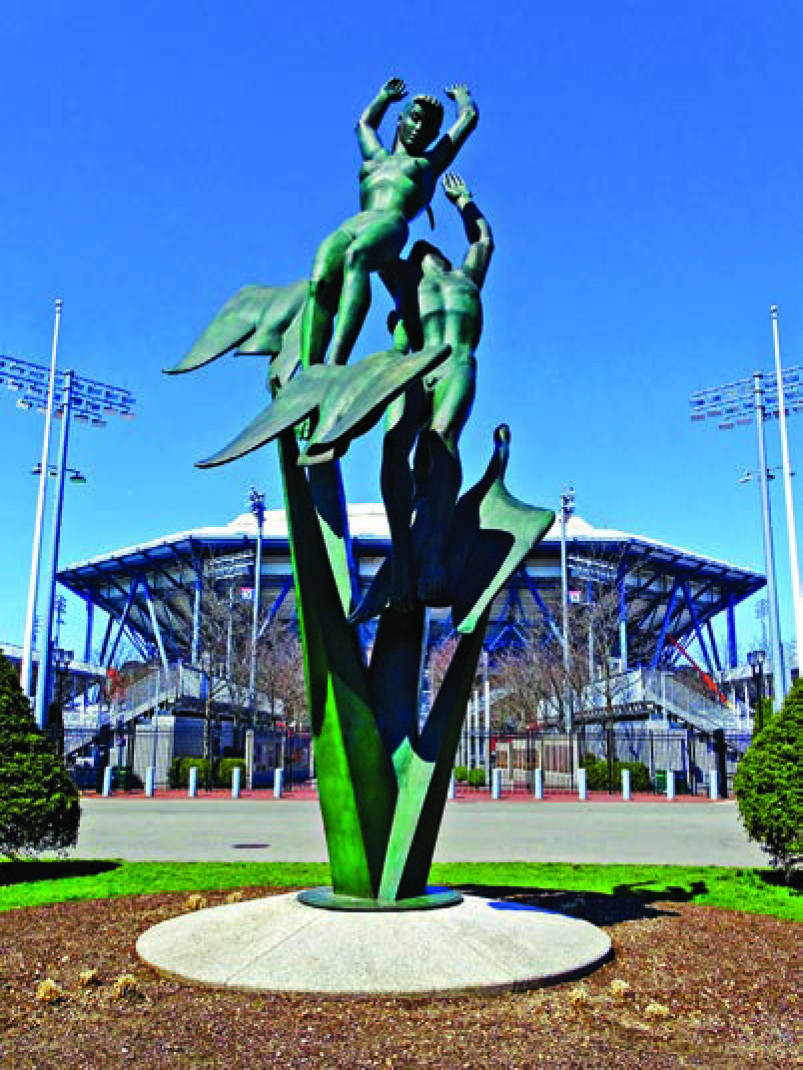 Structures, such as the five sculptures still on-site, evoked the fair’s futuristic themes, where modernism meets the Space Age. The world’s largest sculpture of Earth, the Unisphere, sponsored by U. S. Steel, symbolized the fair and today represents the park and borough of Queens. Designed by Gilmore Clarke, it is located where the previous fair’s Perisphere stood. It is the only structure from two world fairs that New York City’s Landmarks Preservation Commission deemed landmark-worthy.