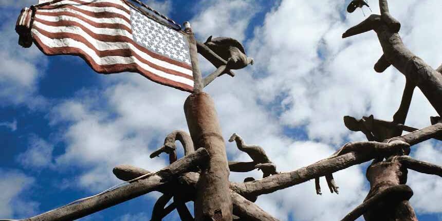Dinsmoor started the Garden with a simple fence, then added his ‘Cabin Home,’ built from native Post Rock limestone, so called because of its use as fence posts due to lack of timber in the Kansas prairie. In the Oct. 14, 1909 issue of the Lucas Independent, Dinsmoor described his home as the “Best built house in the state. The most unique outside and prettiest finished inside of any dwelling on earth.” Surrounding his Cabin Home is a forest of concrete trees supporting figural sculptures illustrating the story of the Garden of Eden and Populist Party politics.