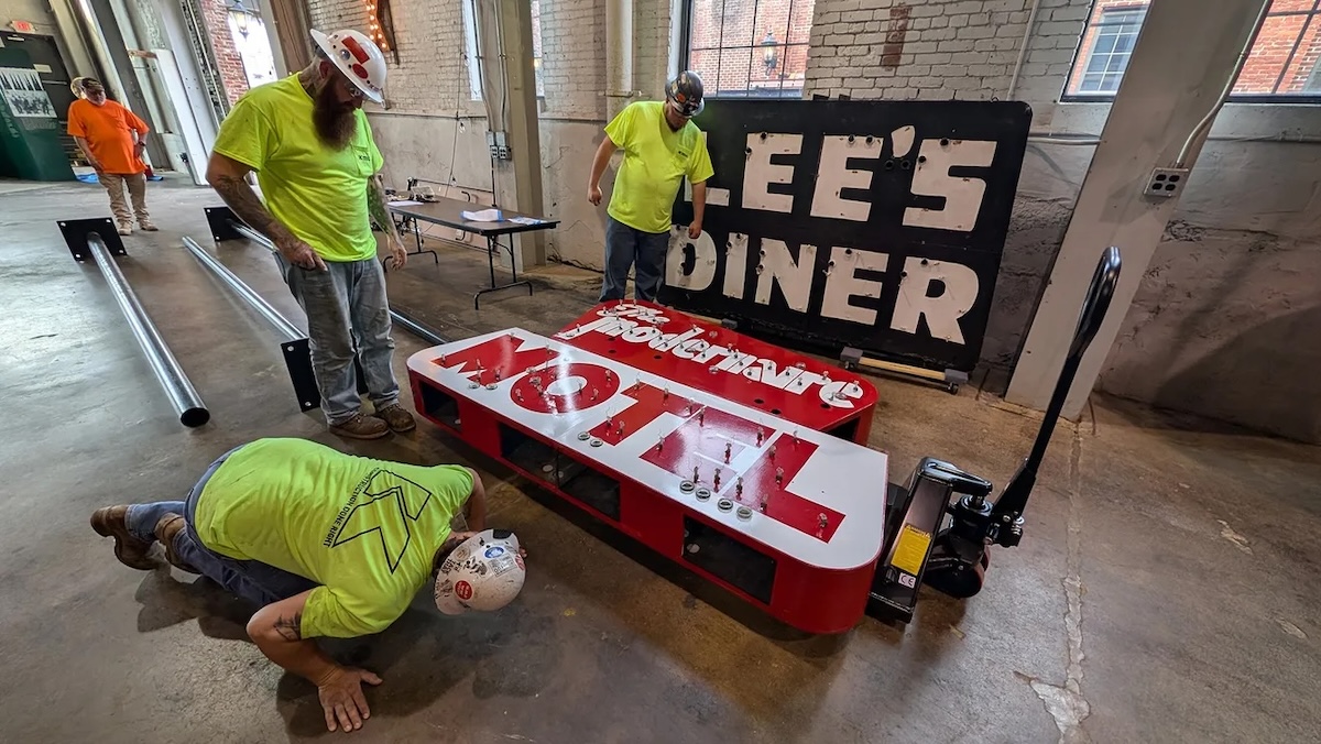 From the York Daily Record: The Moderaire Motel and Lee’s Diner neon signs were hoisted into the air inside the York County History Center’s Agricultural & Industrial Museum on April 15 by Kinsley Construction as they were mounted on their permanent display posts.